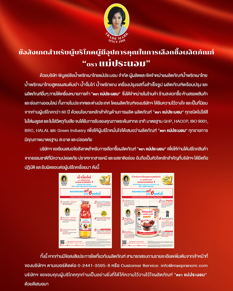 ข้อสังเกตสำหรับผู้บริโภคผู้มีอุปการคุณในการเลือกซื้อผลิตภัณฑ์ “ตรา แม่ประนอม”