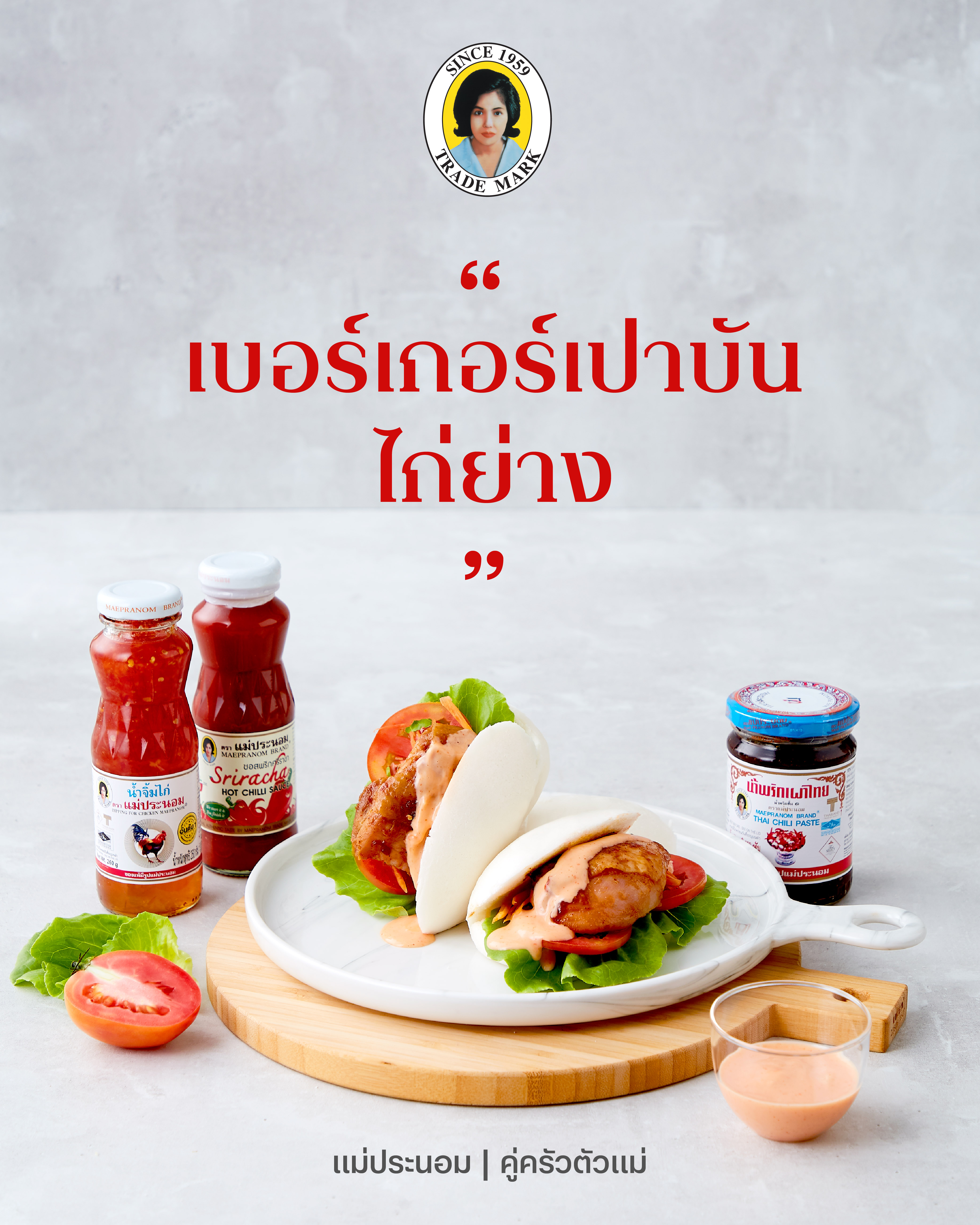 #แม่ประนอม #คู่ครัวตัวแม่ #เบอร์เกอร์เปาบันหรือหมั่นโถว #เนื้อสะโพกไก่เลาะกระดูก # น้ำพริกเผาไทยตราแม่ประนอม # น้ำจิ้มไก่ ตราแม่ประนอม #ผักบัตเตอร์เฮด #มะเขือเทศหั่นแว่น #แครอทขูดฝอยเล็ก # มายองเนส #ซอสพริกศรีราชา ตราแม่ประนอม