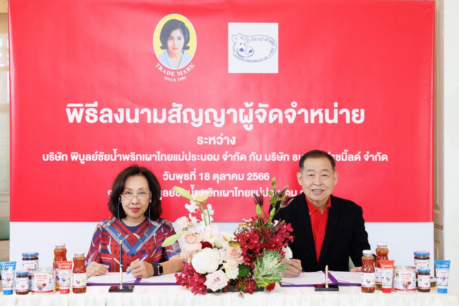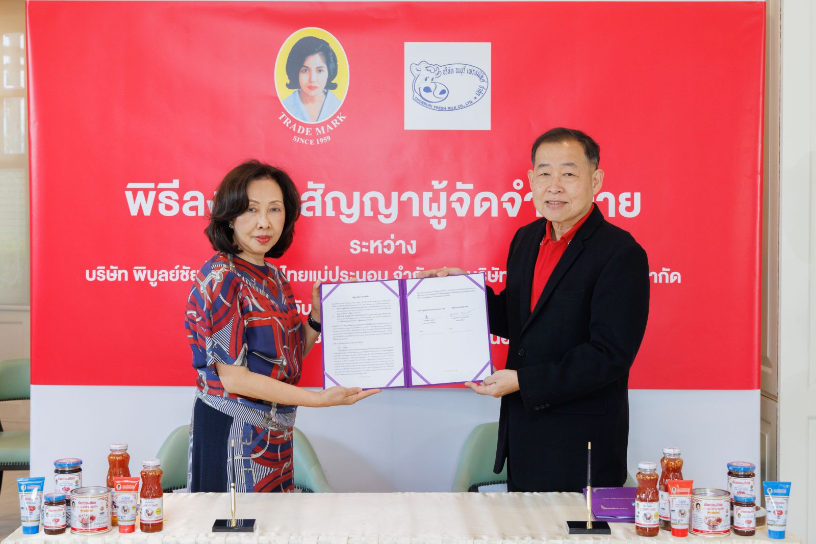 พิธีลงนามสัญญาแต่งตั้งผู้จัดจำหน่าย ระหว่าง บริษัท พิบูลย์ชัยน้ำพริกเผาไทยแม่ประนอม จำกัด และ บริษัท ธนบุรี เฟรชมิลด์ จำกัด