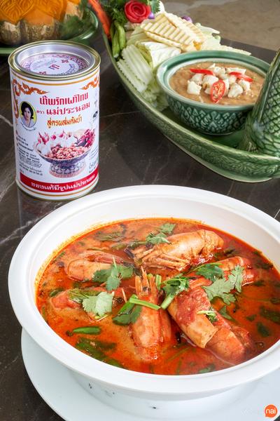มีส่วนประกอบสำคัญอย่าง น้ำพริกเผาไทย        มีพระเอกของจานอย่างกุ้งแม่น้ำไซส์ใหญ่        สูตรผสมต้มยำ ตราแม่ประนอม                                พิเศษ
