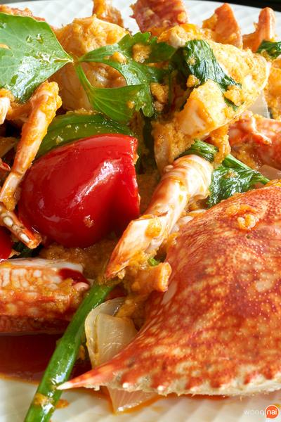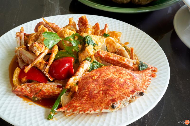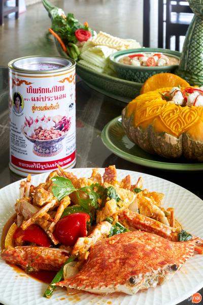 เมนูจานใหญ่เหมาะกับกินเป็นครอบครัว “ปูม้าผัดผงกะหรี่” (250 บาท) ปูม้าจากที่ร้านจะเป็นไซส์ 3 ตัว 1 กิโลกรัม ใช้ น้ำมันน้ำพริกเผาไทย ตราแม่ประนอม เพิ่มสีสันและความหอม แถมเครื่องแน่น ๆ เน้น ๆ กินกับข้าวสวยร้อน ๆ คือฟิน