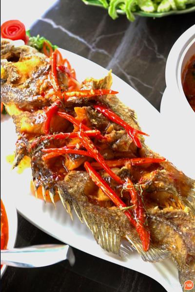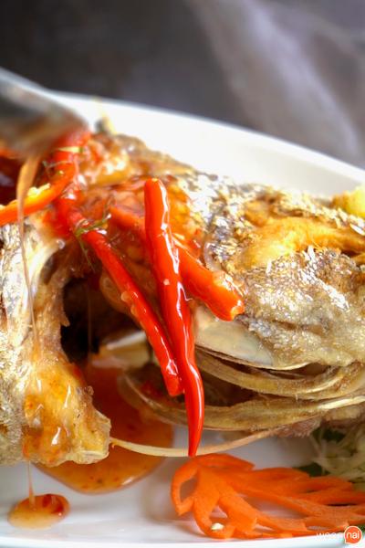 “ปลาเก๋าราดพริก” (280 บาท) ปลาเก๋าทอดกรอบไซส์ใหญ่พิเศษ น้ำราดคือทีเด็ดเลยค่ะ ใช้น้ำจิ้มไก่ ตราแม่ประนอม ปรุงเพิ่มด้วยพริกแดงสด และได้ความหอมจากใบมะกรูด