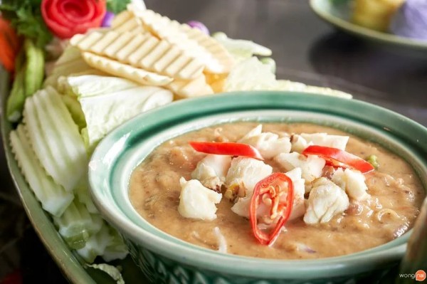 อิ่มแบบเบาท้องต้อง “หลนปู” (250 บาท) จัดจานด้วยภาชนะรูปเรือหงษ์สวยงาม ตัวหลนทางเชฟจะยืนเคี่ยวไปเรื่อย ๆ จนกว่าน้ำจะงวดขั้นต่ำหนึ่งชั่วโมง เสิร์ฟมากับผักพื้นบ้านสด ๆ ปลอดสารพิษ แถมเนื้อปูเน้น ๆ เลยแหละ