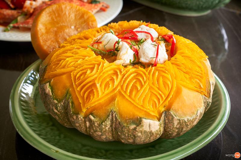 อีกหนึ่งเมนูแกรนด์ “แกงคั่วเนื้อปูฟักทอง” (380 บาท) ใช้เป็นก้อนกรรเชียงปูเน้น ๆ ได้ปริมาณเนื้อปูมากถึงขีดกว่า ๆ เลย ใช้กะทิสด หอม มัน กลมกล่อม เสิร์ฟมาในลูกฟักทองแกะสลักลายสวยงาม งานฝีมือทุกลูก