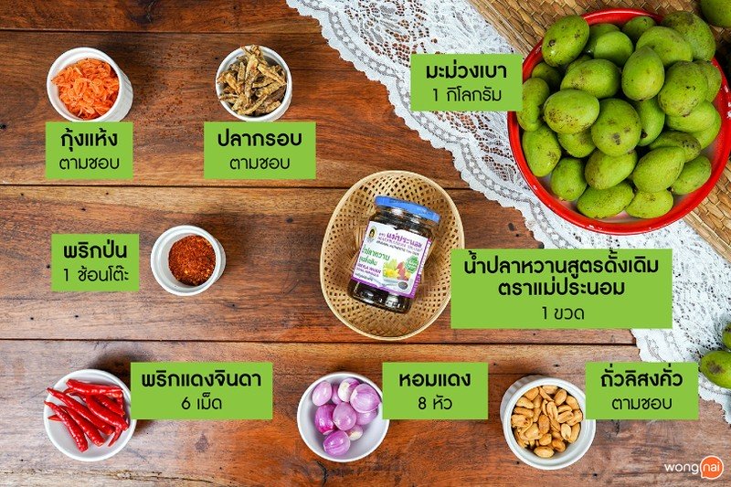- ราดน้ำปลาหวานสูตรดั้งเดิม ตรา แม่ประนอม ลงบนมะม่วงเบาที่หั่นเตรียมไว้