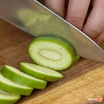 - ล้างมะม่วงเบาให้สะอาด นำมาหั่นขวางเป็นชิ้นพอดีคำ แล้วนำเม็ดออก