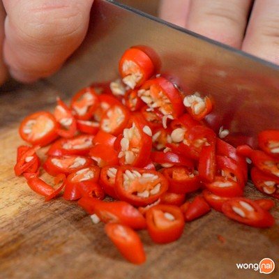 - หั่นพริกแดงจินดา และหอมแดงเตรียมไว้