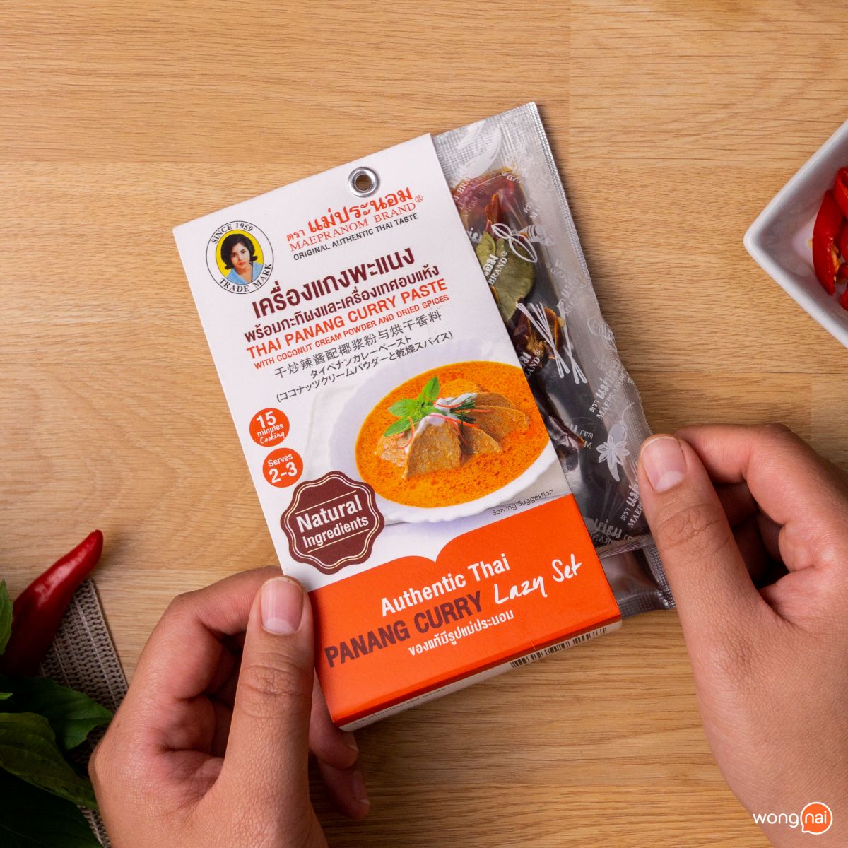 - ใช้เครื่องแกงพะแนงพร้อมกะทิผง และเครื่องเทศอบแห้ง Lazy Set ตราแม่ประนอม โดยนำกะทิผงในเซ็ทผสมกับน้ำอุ่น คนให้ละลาย เตรียมไว้