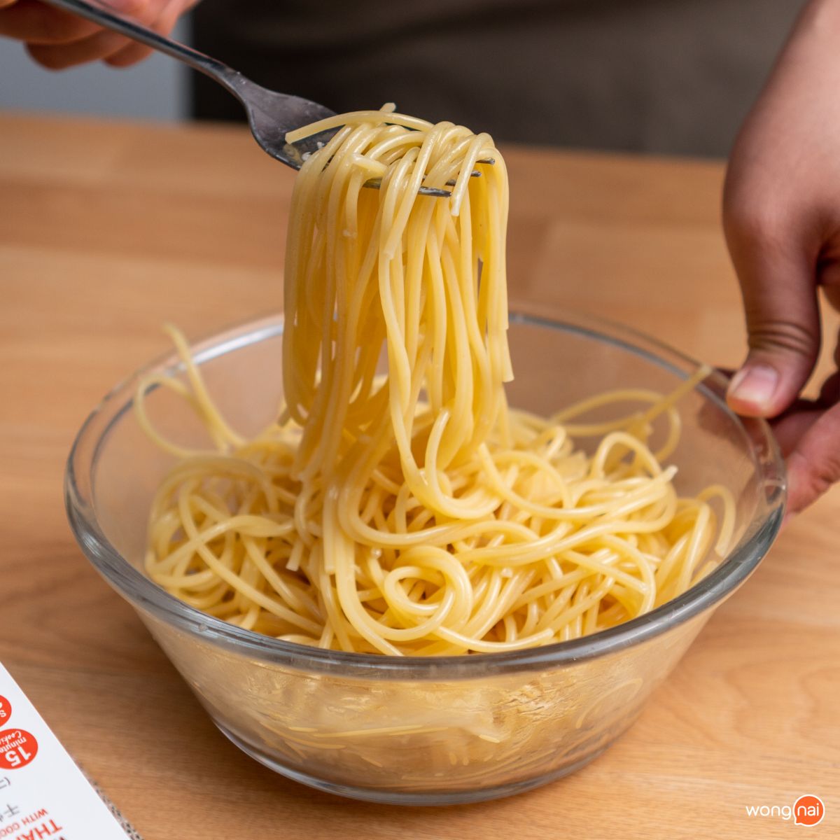 - ตั้งหม้อใส่น้ำเปิดไฟ ใส่เกลือ รอให้น้ำเดือดแล้วลวกเส้นสปาเกตตี 7 นาที แล้วตักขึ้นให้สะเด็ดน้ำ