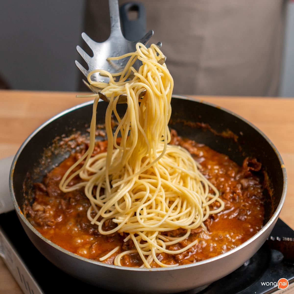 - หลังจากนั้นใส่เส้นสปาเกตตี คลุกเคล้าให้เข้ากัน