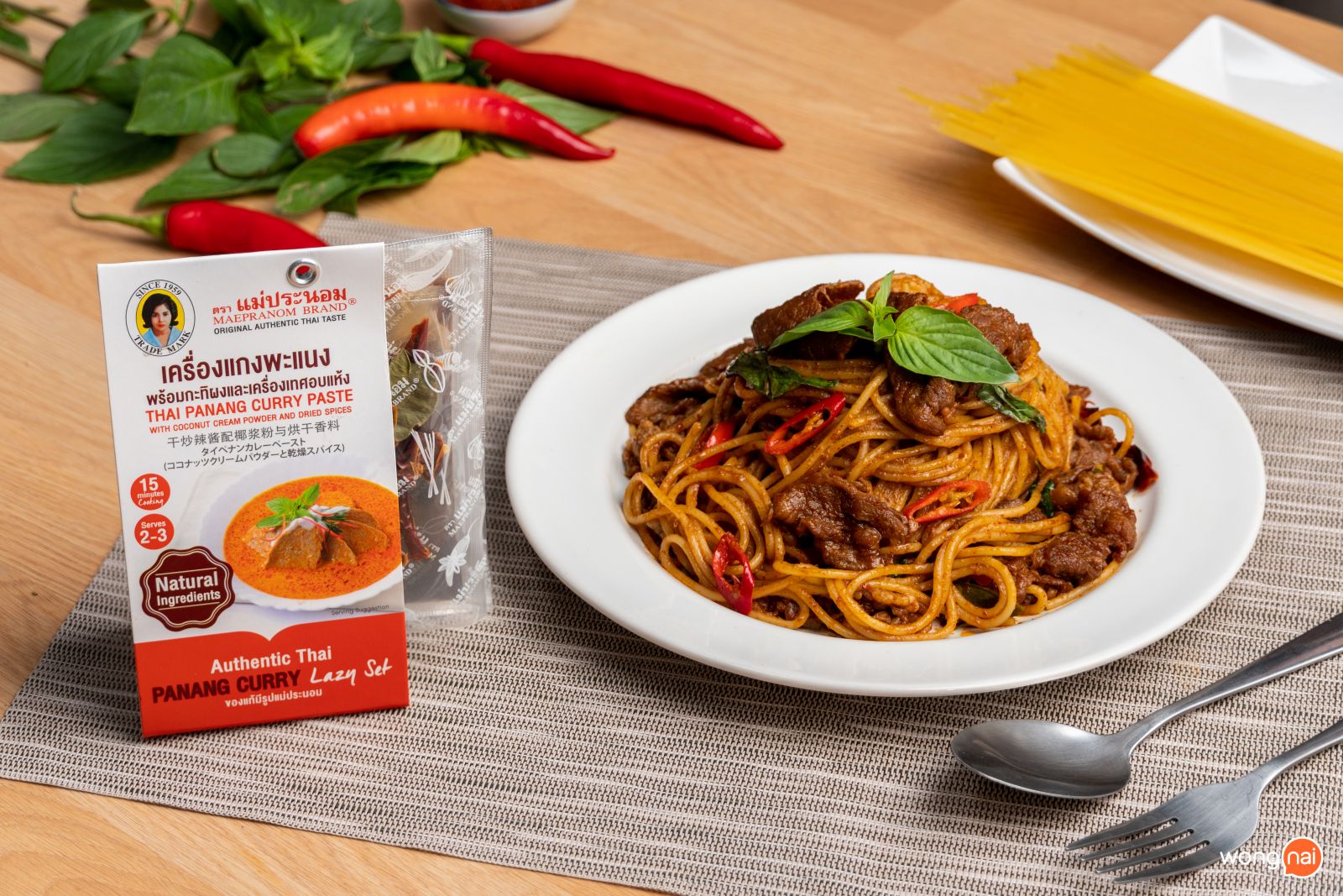 เสร็จเป็นที่เรียบร้อยแล้วนะคะกับ “สปาเกตตีพะแนงเนื้อ”เมนูแกงเส้นคลุกเคล้าเครื่องแกงพะแนงหอม ๆ รสเข้มข้นตามแบบต้นตำรับไทยแถมยังทำง่ายภายในเวลา 15 นาทีอีกด้วย จานนี้ต้องขอขอบคุณตัวช่วยพิเศษอย่าง เครื่องแกงพะแนงพร้อมกะทิผง และเครื่องเทศอบแห้ง Lazy Set ตราแม่ประนอม เพียงแค่แกะซองก็สามารถใช้ทำแกงพะแนงได้ทุกชนิดสะดวกโดยไม่ต้องปรุงเพิ่ม รสชาติดีเหมือนต้นตำรับทั้งยังผลิตจากวัตถุดิบธรรมชาติ ปราศจากสี สารปรุงแต่ง ไม่ใส่ผงชูรส และวัตถุกันเสียแถมยังทำให้การทำอาหารเป็นเรื่องง่าย และสนุก ถ้าเพื่อนๆ คนไหนสนใจซื้อ เครื่องแกงพะแนงพร้อมกะทิผง และเครื่องเทศอบแห้ง Lazy Set ตราแม่ประนอม สามารถหาซื้อได้ที่ห้างสรรพสินค้า ซุปเปอร์มาร์เกตชั้นนำ หรือที่ร้านแฟลกชิพสโตร์แม่ประนอม ณ เมืองสุขสยาม ศูนย์การค้าไอคอนสยาม ชั้น G และช่องทางสั่งซื้อออนไลน์ที่ Inbox Facebook : Maepranom , Line : @maepranombrand ได้เลยจ้า!