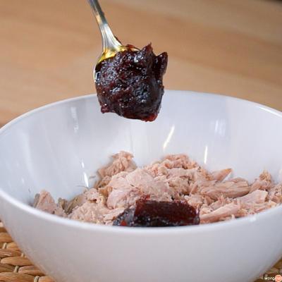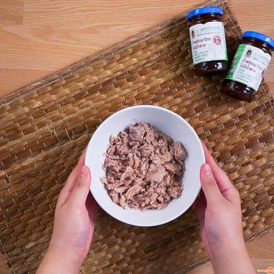 เทเนื้อทูน่ากระป๋องใส่ชาม ผสมเนื้อทูน่ากับน้ำพริกเผาไทยไม่มีน้ำตาล
