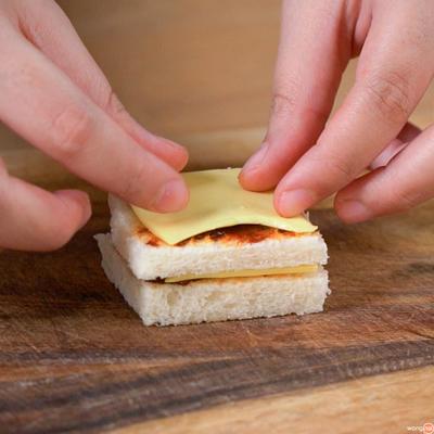 - นำขนมปังตัดขอบมาหั่นเป็นสี่เหลี่ยมจัตุรัสขนาดเท่า ๆ กัน จากนั้นทาขนมปังด้วย น้ำพริกเผาไทยไม่มีน้ำตาล ตราแม่ประนอม และวางด้านบนด้วยชีสเชดดาร์ ทำซ้ำแบบนี้อีก 2 ชั้น ด้านบนสุดให้โรยชีสมอสซาเรลลาไว้