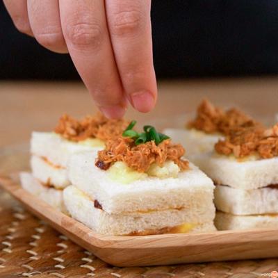 โรยด้านบนด้วยต้นหอมสำหรับตกแต่ง “แซนด์วิชน้ำพริกเผาทูน่า” พร้อมเสิร์ฟ