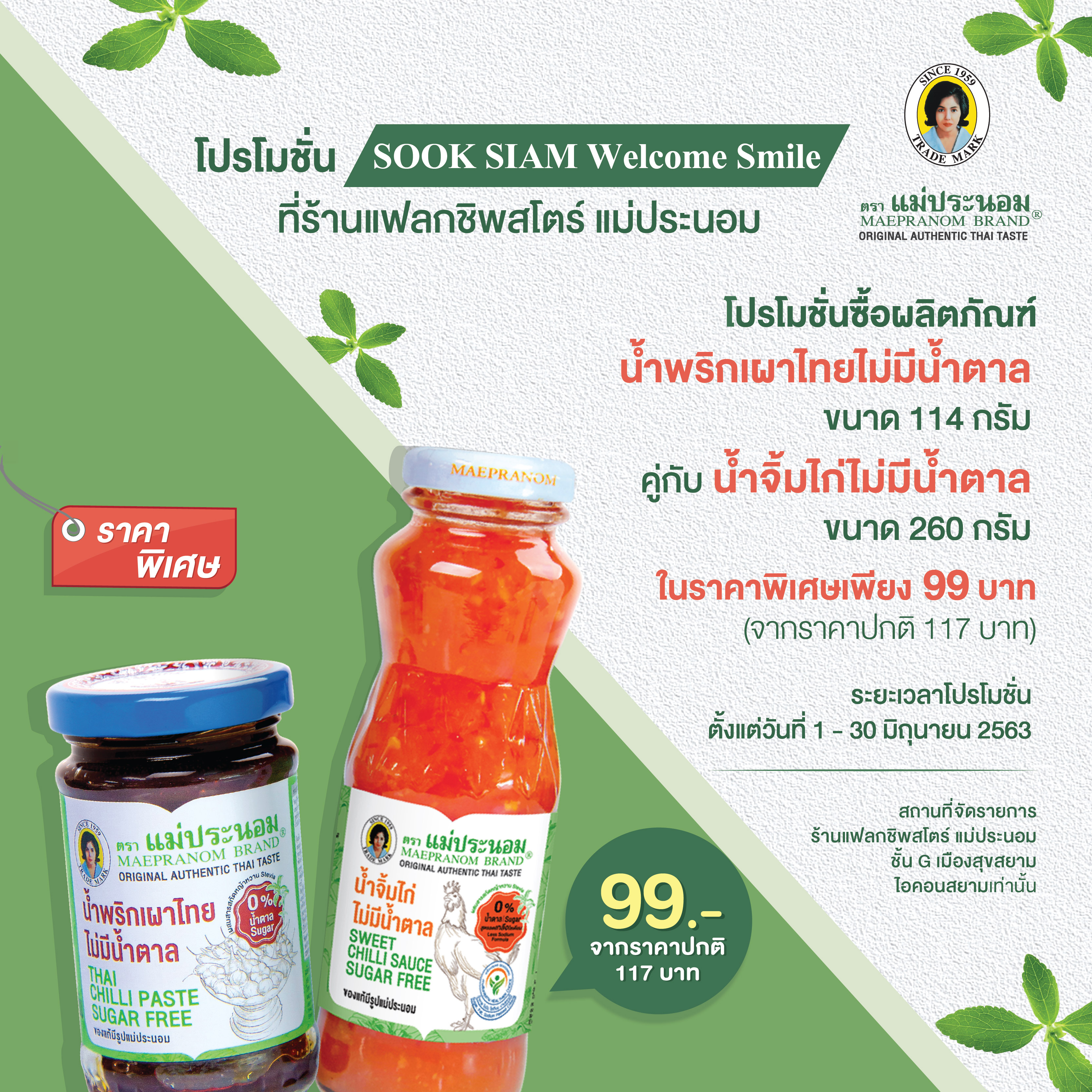 โปรโมชั่นซื้อผลิตภัณฑ์น้ำพริกเผาไทยไม่มีน้ำตาล ขนาด 114 กรัม คู่กับน้ำจิ้มไก่ไม่มีน้ำตาล ขนาด 260 กรัม ในราคาพิเศษ เพียง 99 บาท (จากราคาปกติ 117 บาท)