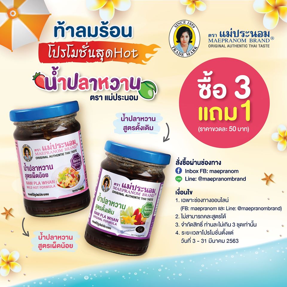 คนรักมะม่วงน้ำปลาหวานห้ามพลาด!! .....พบกับโปรร้อนแรงรับลมร้อน น้ำปลาหวาน ตราแม่ประนอม ซื้อ 3 แถม 1 มีให้เลือก 2 สูตร (สูตรดั้งเดิม และสูตรเผ็ดน้อย) สำหรับสั่งซื้อผ่านทางออนไลน์เท่านั้น FB: maepranom / Line: @maepranombrand